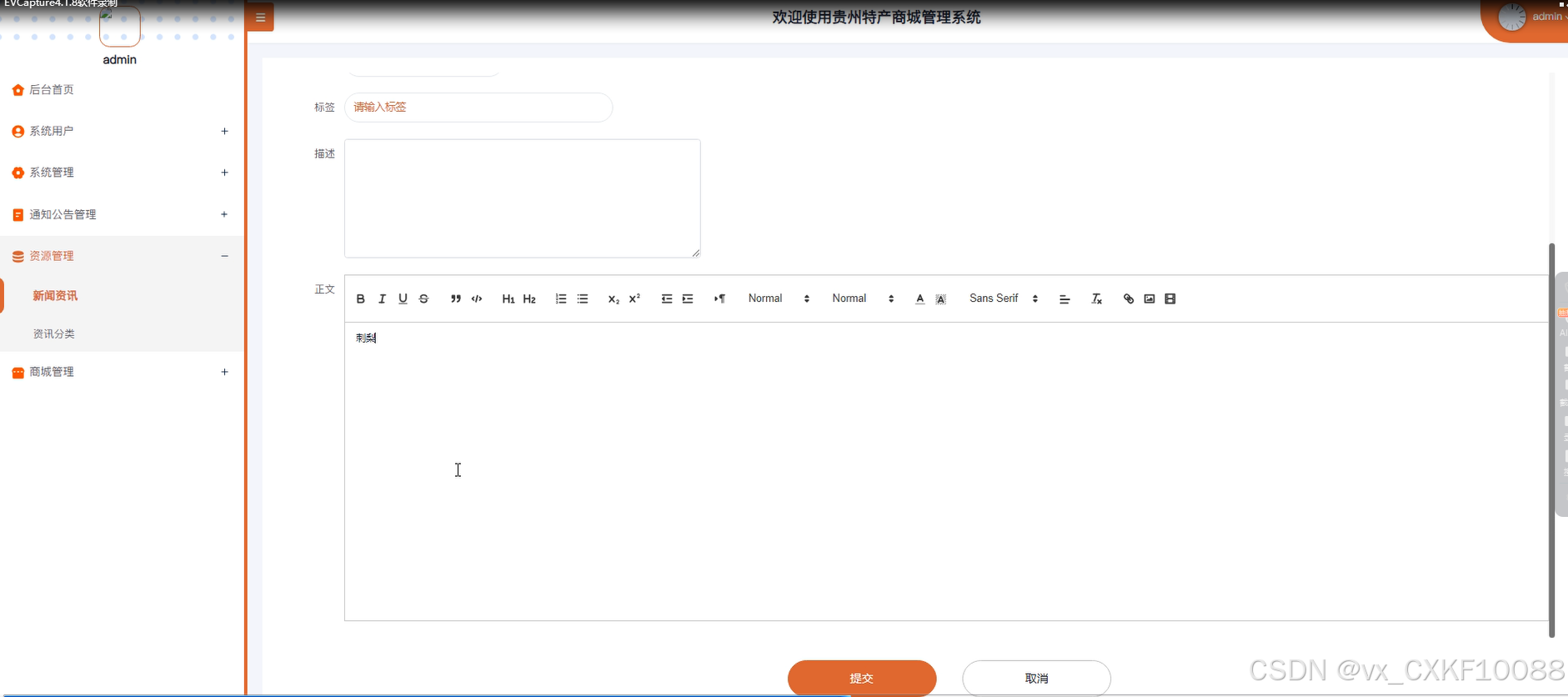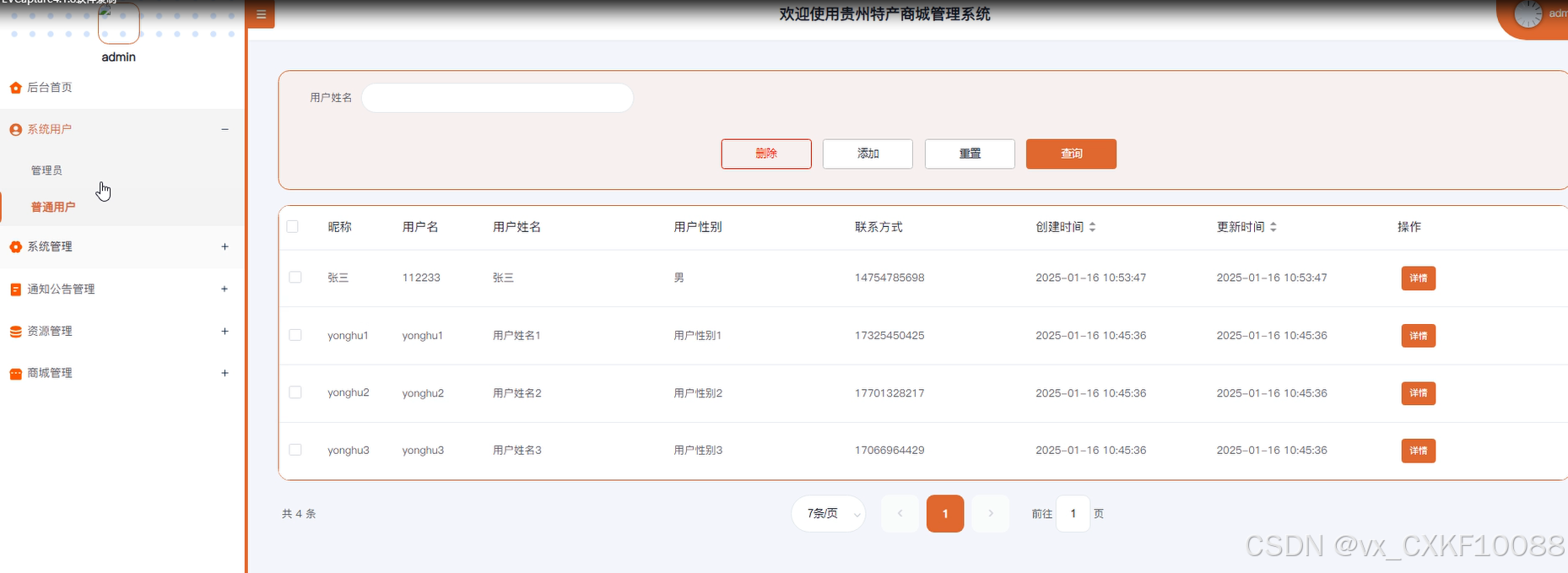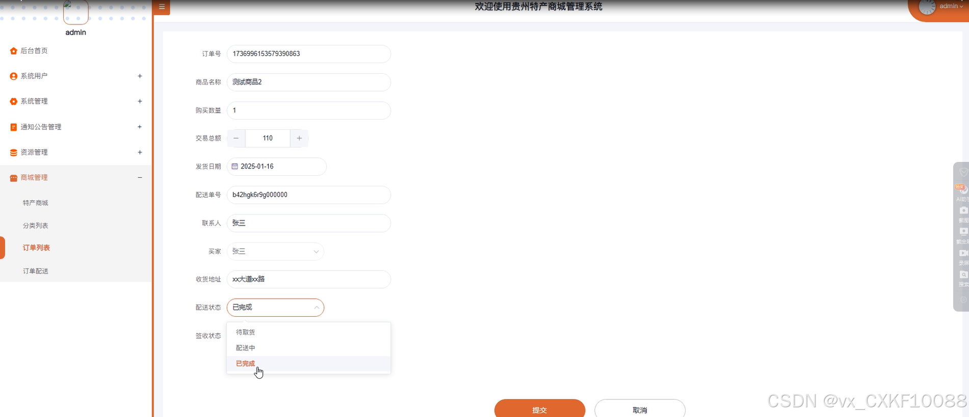 商城管理:管理员可以管理特产商城信息、分类列表、订单列表查询等信息,可以进行增删改查等操作。