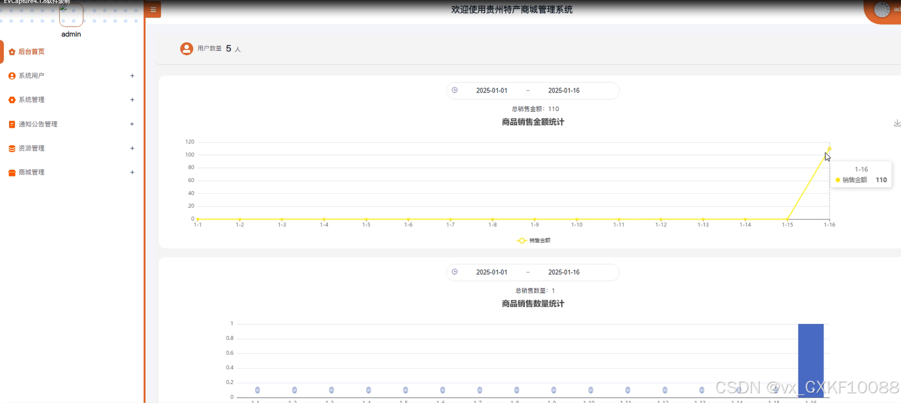 后台首页:展示平台关键数据统计,如用户数、商品数、订单量等。支持图表化展示以辅助决策。