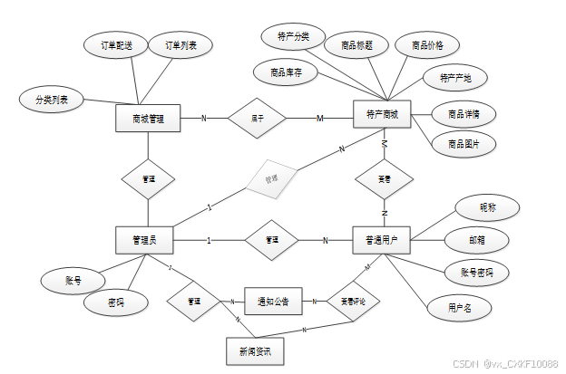 本文在系统分析阶段就抽取了一些实体,根据实体之间的关系,经过分析进行系统E-R图的设计。贵州特产商城管理系统总体E-R图如下图所示。