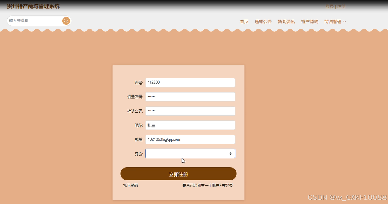 注册登录:普通用户需要购买浏览商品需要注册账号密码,包括设置账号、密码、昵称、邮箱等信息,注册完成后通过账号密码登录。