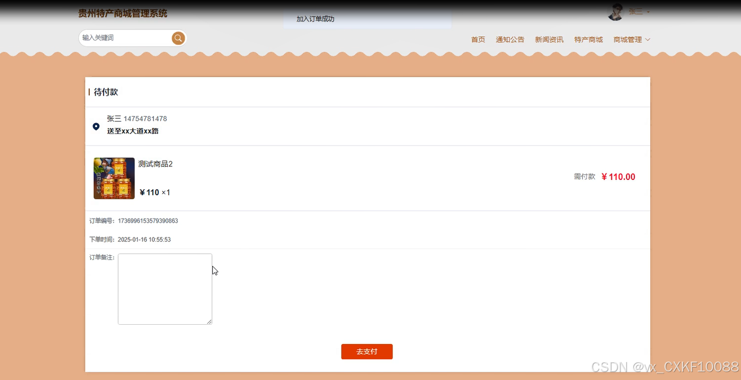 | TC003 | 验证未输入订单备注,点击提交 | 1. 进入贵州特产商城下单界面 <br> 2.未输入订单备注,点击提交 <br> 3. 点击提交按钮 | 提示请输入订单备注 | 提示请输入订单备注 | 通过 |