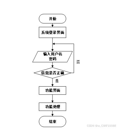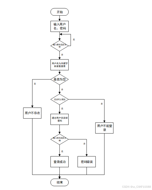 用户输入用户名和密码后,系统先检查输入是否为空,再验证用户名是否存在,若存在则通过用户名获取密码并校验。若密码正确则登录成功,否则提示密码错误。若用户名不存在或无法登录,提示用户操作无效。如下图所示。