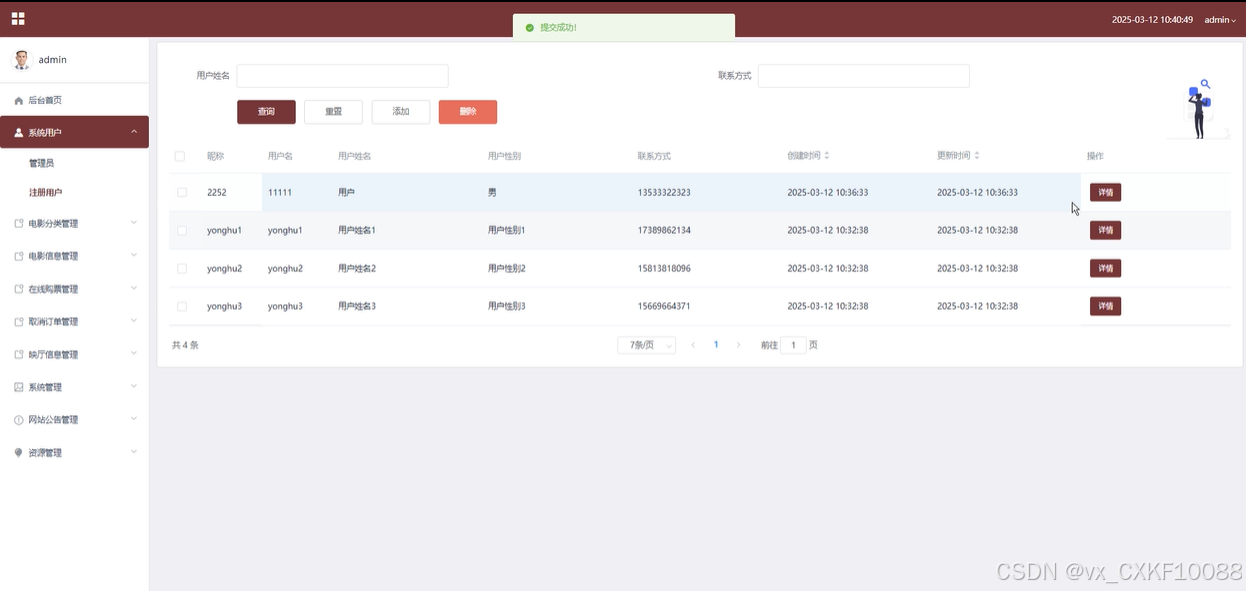 系统用户:管理员能够查看所有系统用户的详细信息,包括注册用户和管理员账户。管理员有权限对用户账户进行增、删、改、查等操作,能够有效管理平台的用户信息。