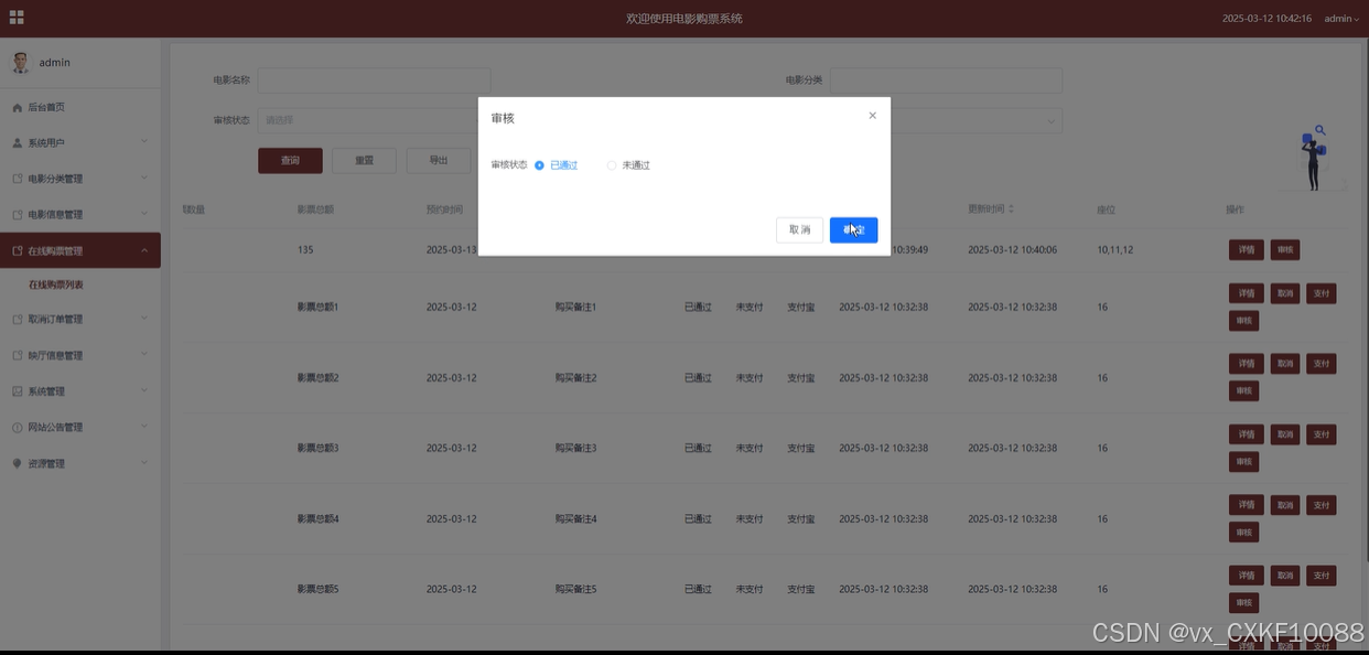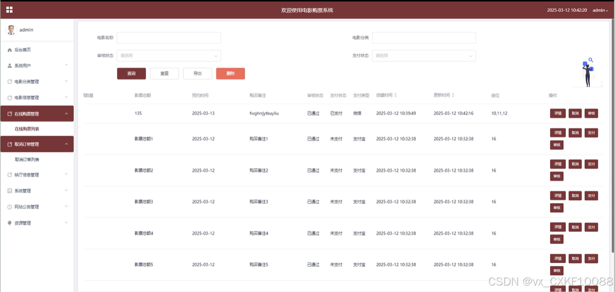 管理员可以查看用户的在线购票详情,审核用户的购票申请,确保票务信息的正确性。管理员还可以处理票务的支付与取消操作,同时具备增、删、改、查的管理权限,管理所有购票记录。如下图所示。