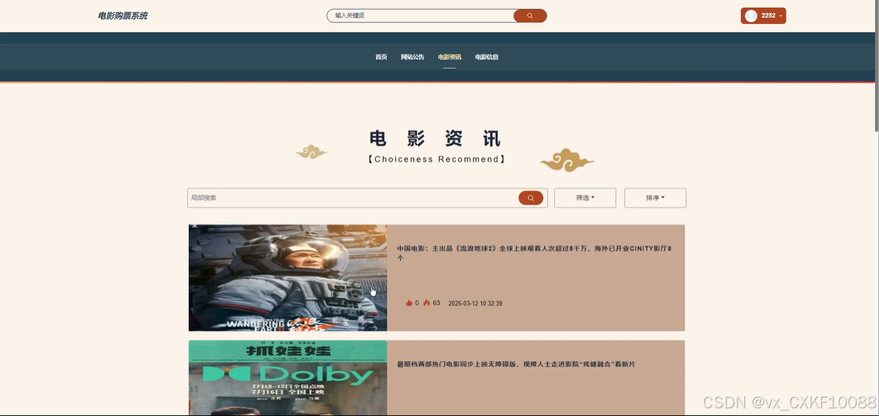 电影资讯:用户可以浏览电影资讯,查看详情了解最新的电影新闻、影评、导演动态等。通过搜索功能,用户可以快速找到感兴趣的电影资讯内容。用户可以点赞、收藏、评论自己感兴趣的资讯,也可以回复其他用户的评论进行互动。