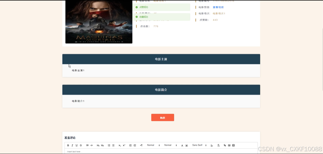 电影信息:在电影信息页面,用户可以查看电影的详细资料,包括电影名称、编号、分类等基本信息。同时,系统会提供电影的预告片视频,用户可以直接观看。此外,电影的票价信息也会显示在此页面。用户可以点赞、收藏电影信息,并且可以直接进行购票操作。