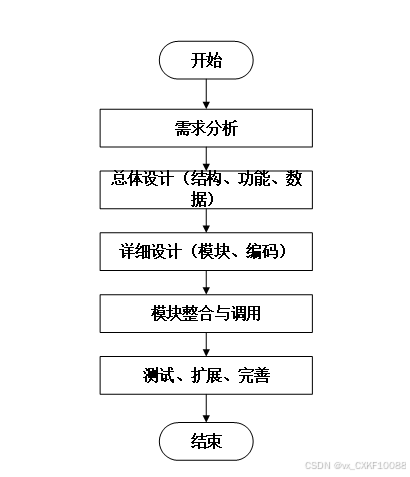 系统开发流程的主要步骤,从需求分析到系统完成的全过程。流程包括需求分析、总体设计(结构、功能、数据)、详细设计(模块、编码)、模块整合与调用,以及测试、扩展和完善,最终完成系统的开发。本系统的开发流程如下图所示。