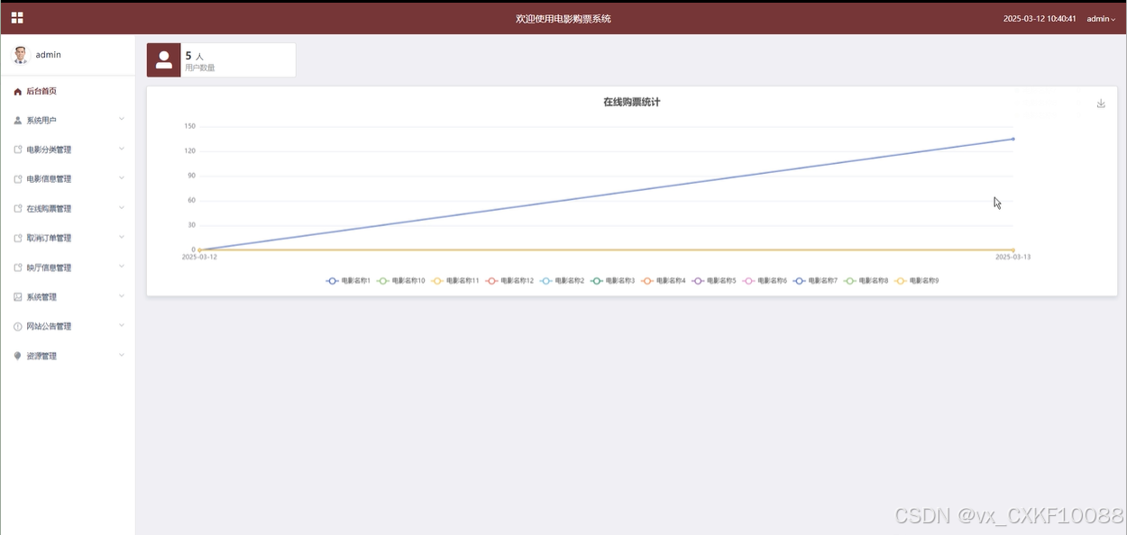 后台首页:管理员可以在后台首页查看平台的统计信息,如在线购票的统计数据、折线图展示等。管理员还可以管理自己的个人资料和密码,确保后台操作的安全性。