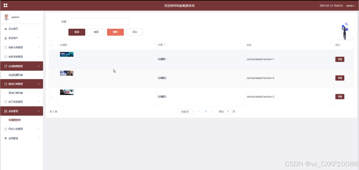 系统管理模块让管理员能够对平台的轮播图进行管理。管理员可以通过该模块对轮播图进行增、删、改、查操作,确保平台首页展示的内容及时更新、符合用户需求。如下图所示。
