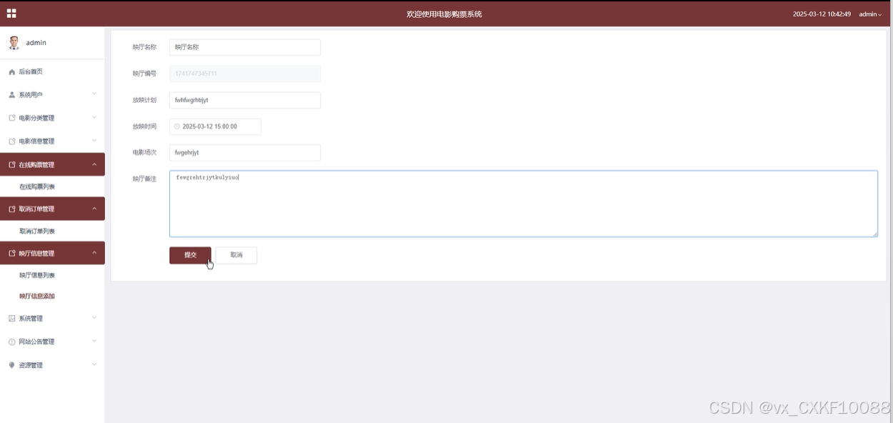 映厅信息管理:管理员可以查看和添加影院映厅的信息,包括映厅的座位数、屏幕大小、放映设备等内容。管理员可以通过该模块进行映厅信息的查询、修改、删除等操作,确保影厅信息的准确性。