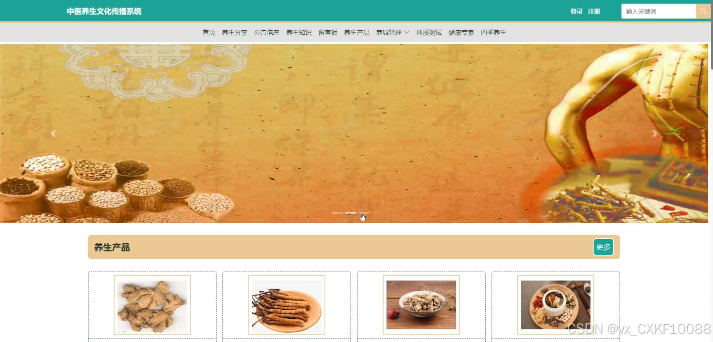 - 首页:首页是用户访问平台后看到的第一个界面,展示养生产品、养生知识、健康专家推荐和四季养生建议。用户可以快速浏览各类信息,了解平台提供的服务和产品,同时获取健康生活的小贴士。