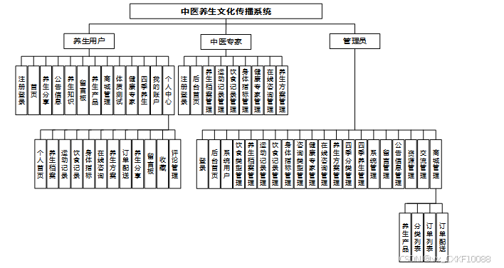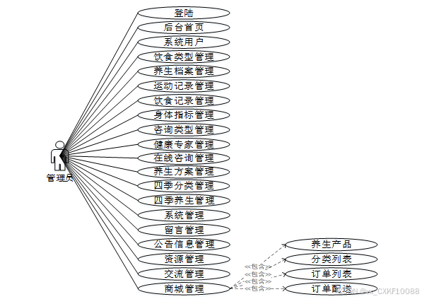 管理员可以对养生产品和分类列表进行添加、删除、查询操作,并查看养生产品的详细信息以及用户的评论,管理订单列表和订单配送,确保商城运营的顺畅和用户的购物体验。模块如下图所示。