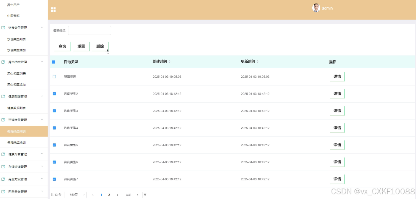 - 咨询类型管理:管理员可以对咨询类型进行添加、删除、查询操作,并查看咨询类型的详细信息,以满足不同用户的健康咨询需求。