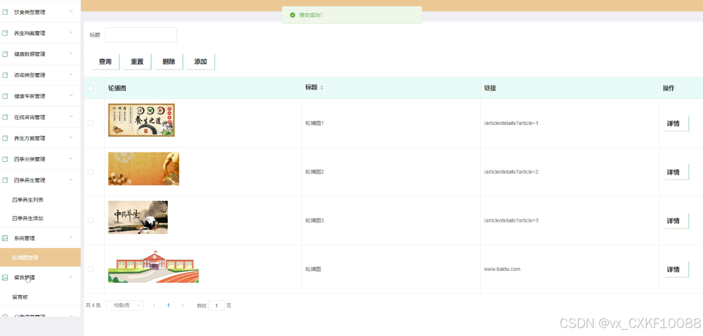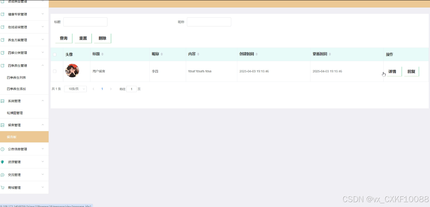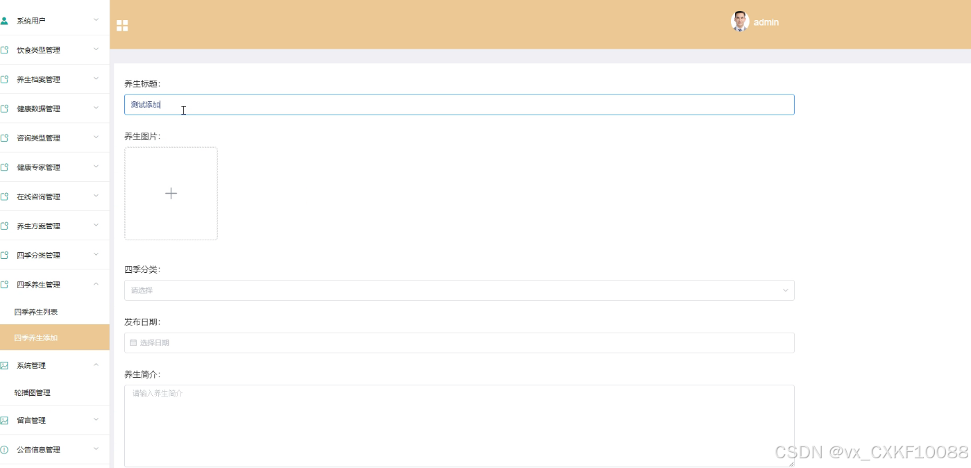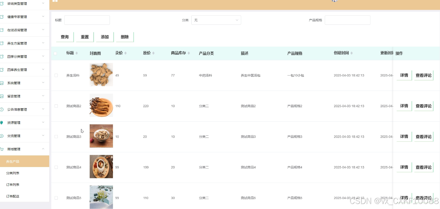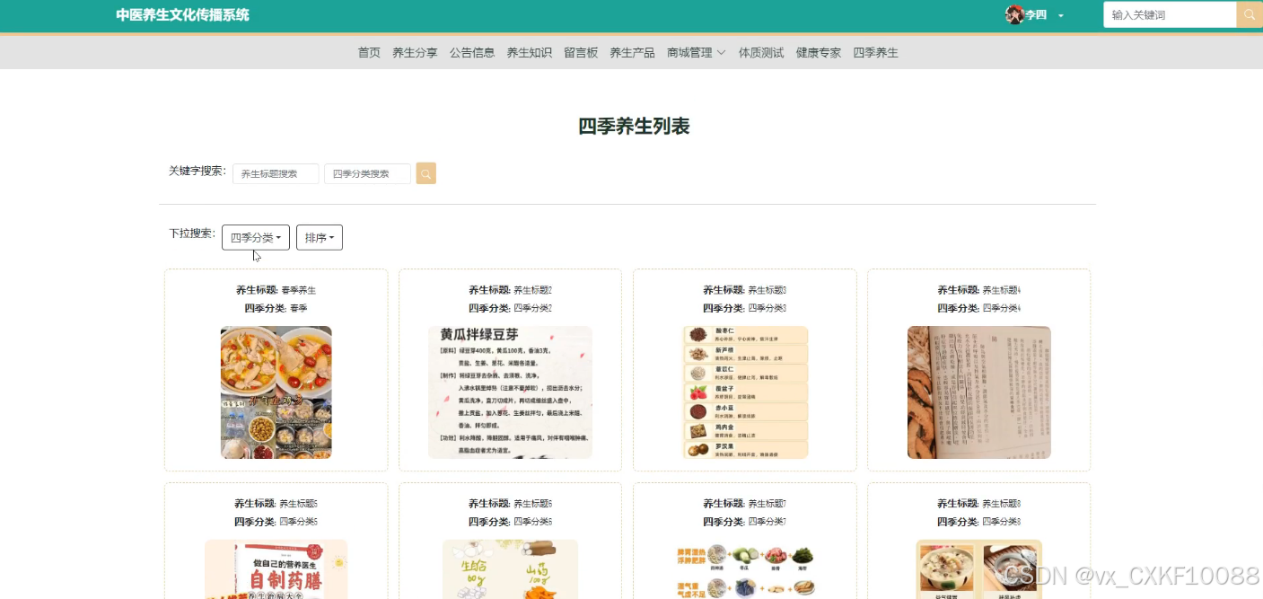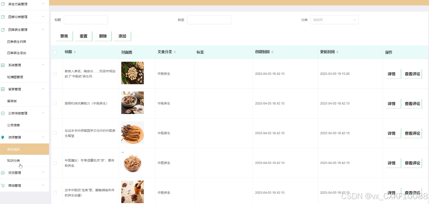 - 四季分类管理:管理员可以对四季分类进行添加、删除、查询操作,并查看四季分类的详细信息,以满足不同季节的养生需求。