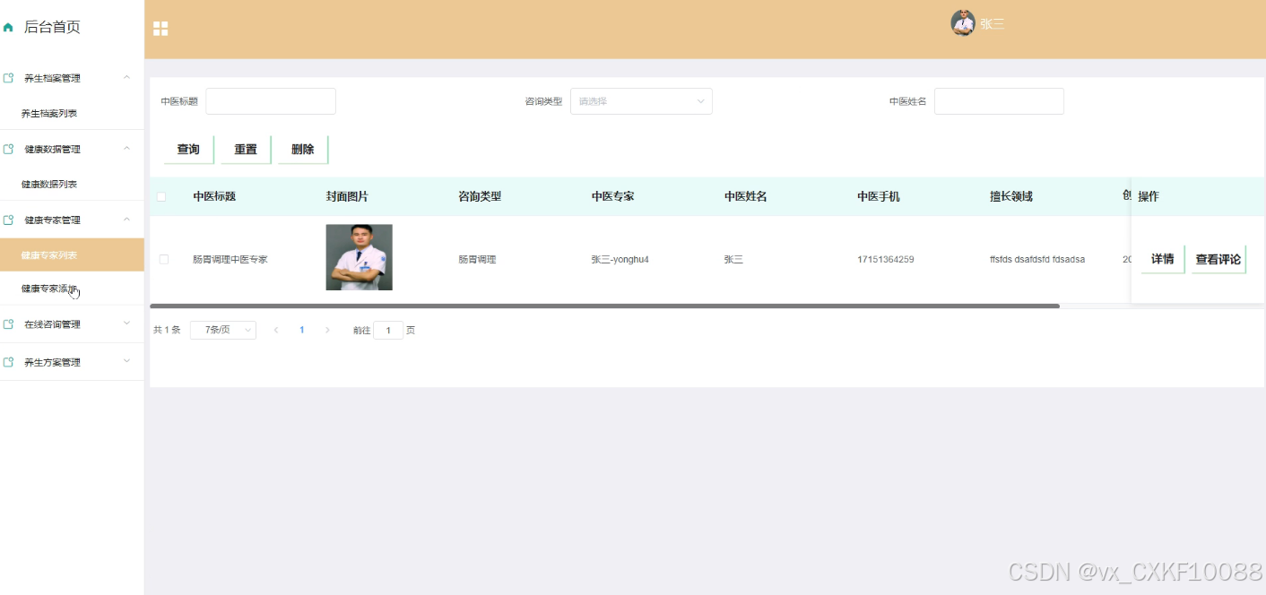 - 健康专家管理:管理员可以在此模块进行健康专家的添加、删除和查询操作,点击专家详情可以查看专家的详细信息和用户评论,以便更好地管理专家资源。