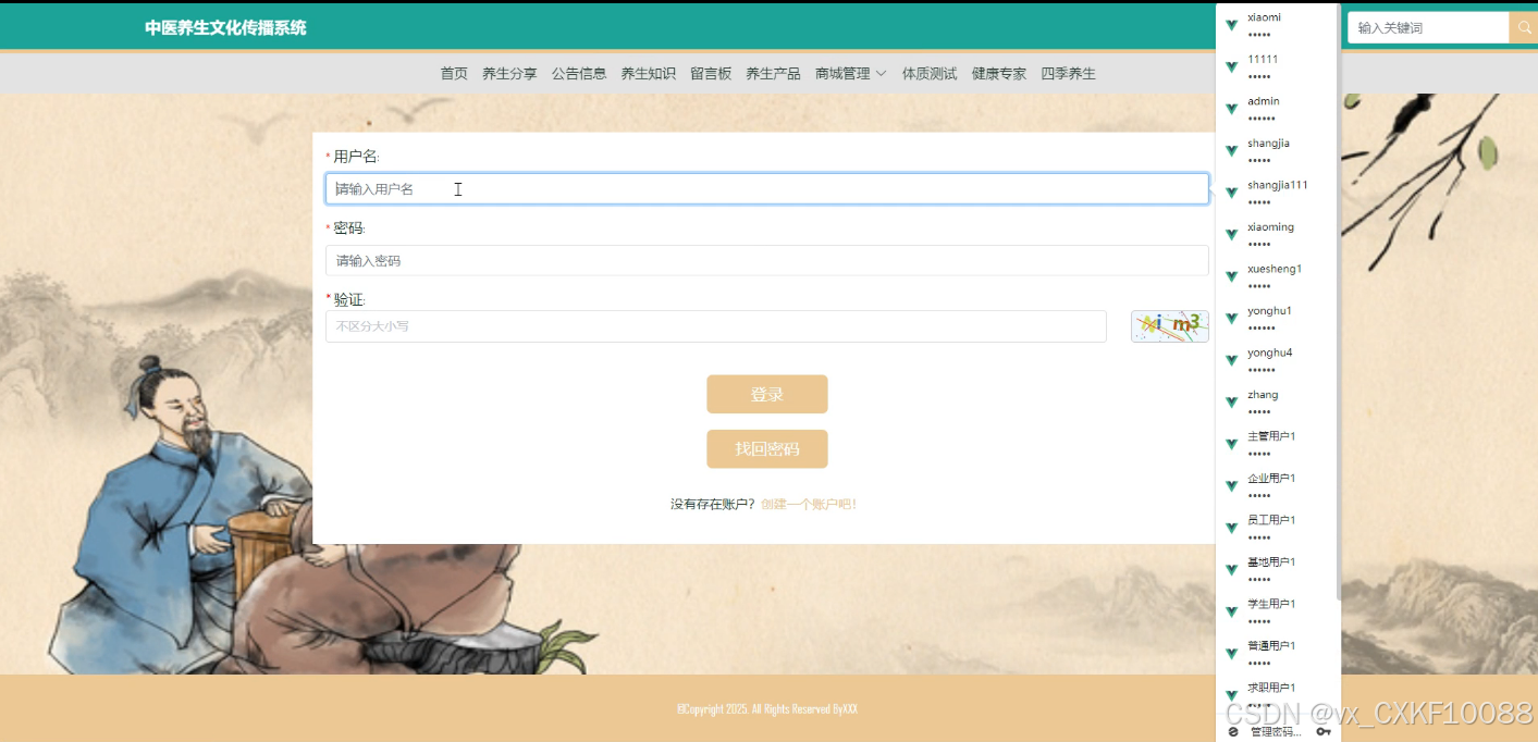 - 注册登录:用户可以通过注册功能创建个人账户,输入必要的信息如用户名、密码、邮箱等。登录功能允许用户输入凭证来访问他们的个人资料和养生内容。系统支持密码找回和邮箱验证,确保用户账户的安全性。