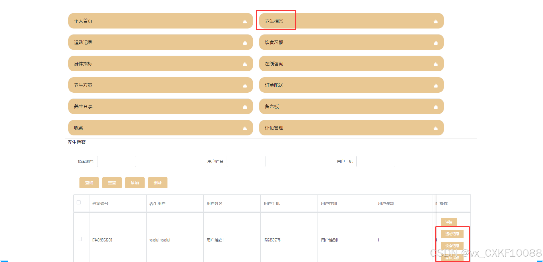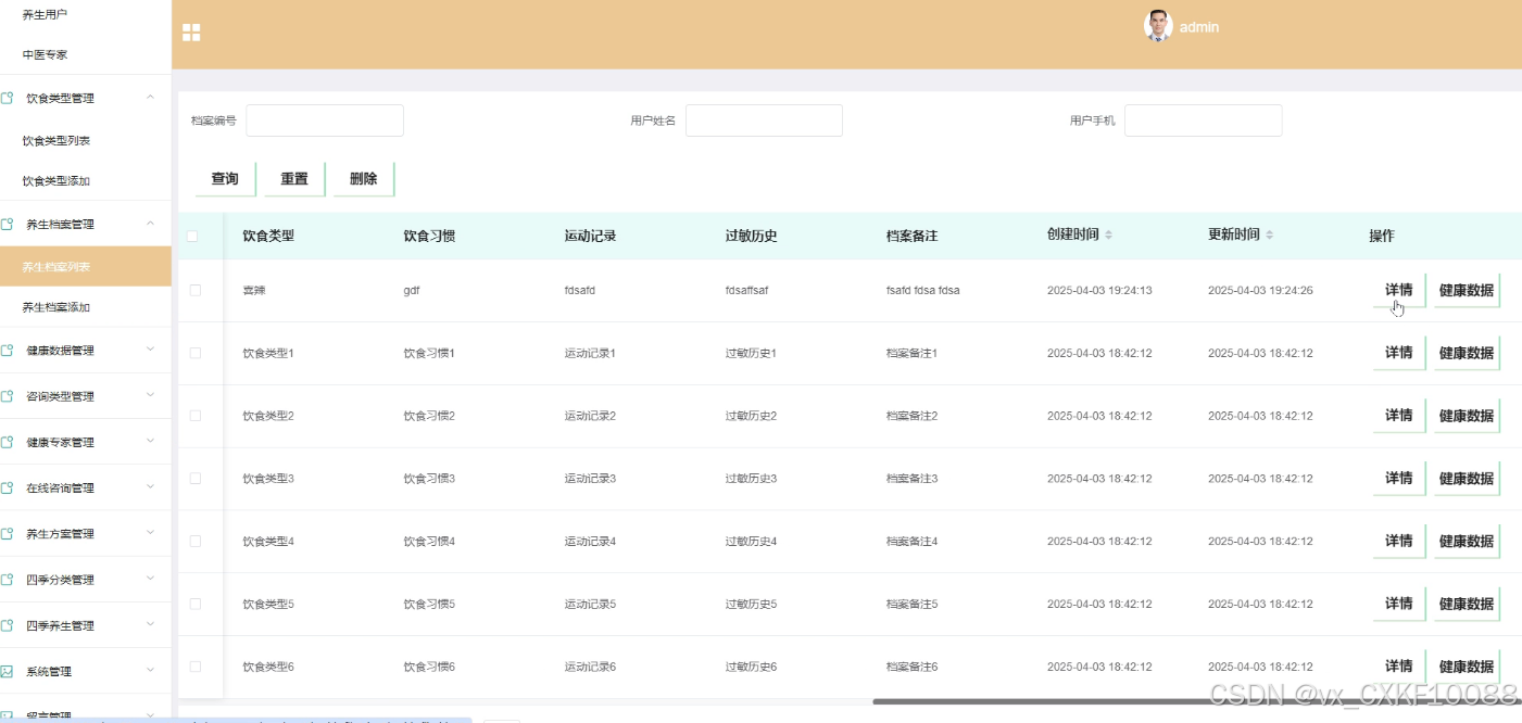 - 养生档案管理:管理员可以在此模块进行养生档案的查询和查看详细信息,以便更好地了解用户的健康状况。
