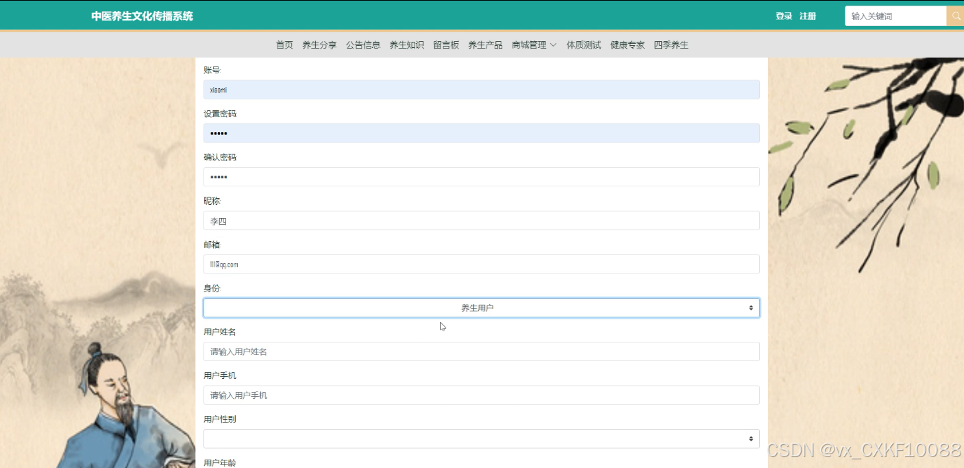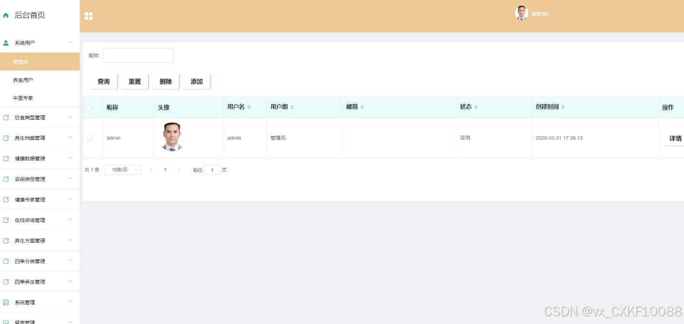 - 系统用户管理:系统支持管理员、养生用户、中医专家等不同类型的用户。管理员拥有管理所有用户状态的权限,包括增删改查等操作,以维护系统的正常运行和用户信息的准确性。