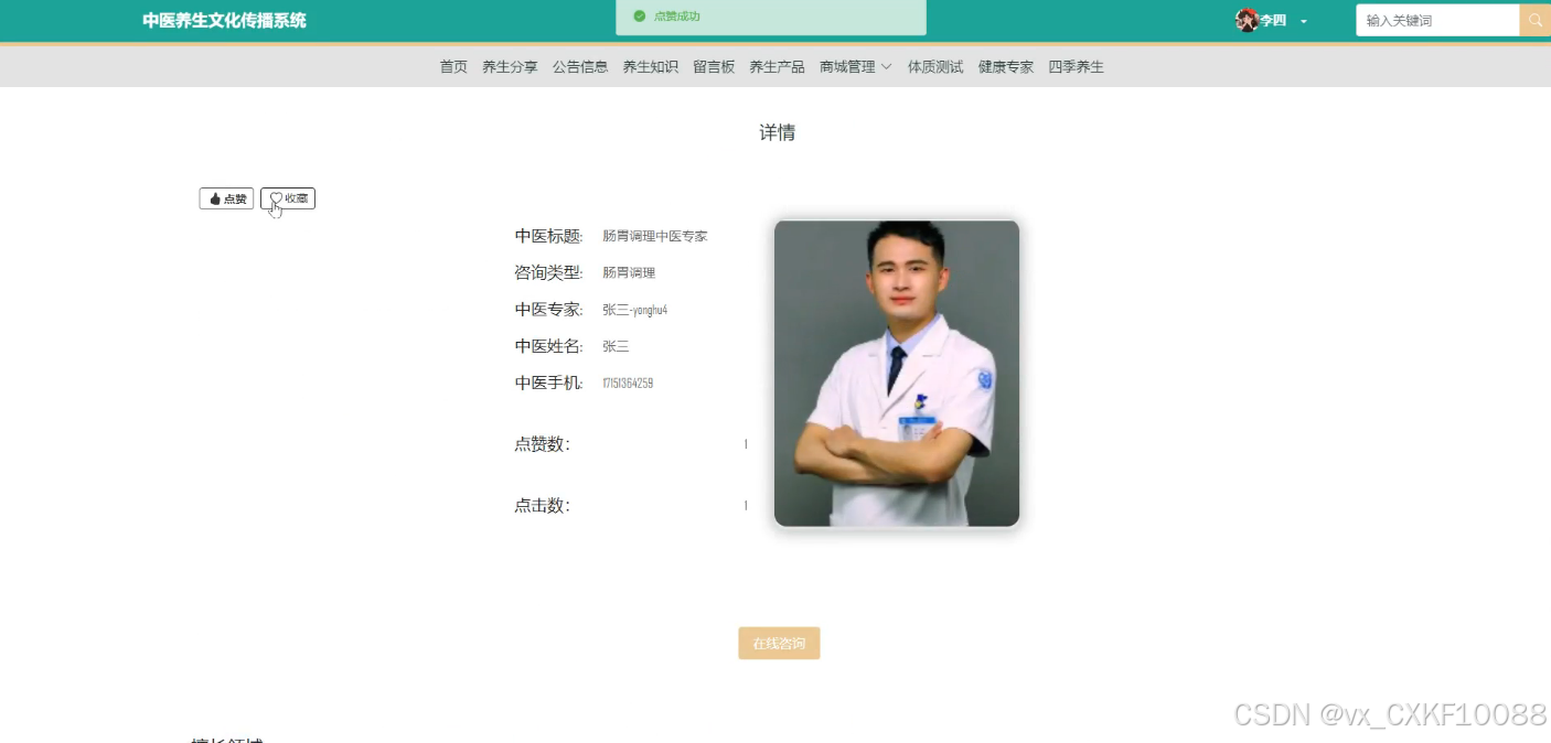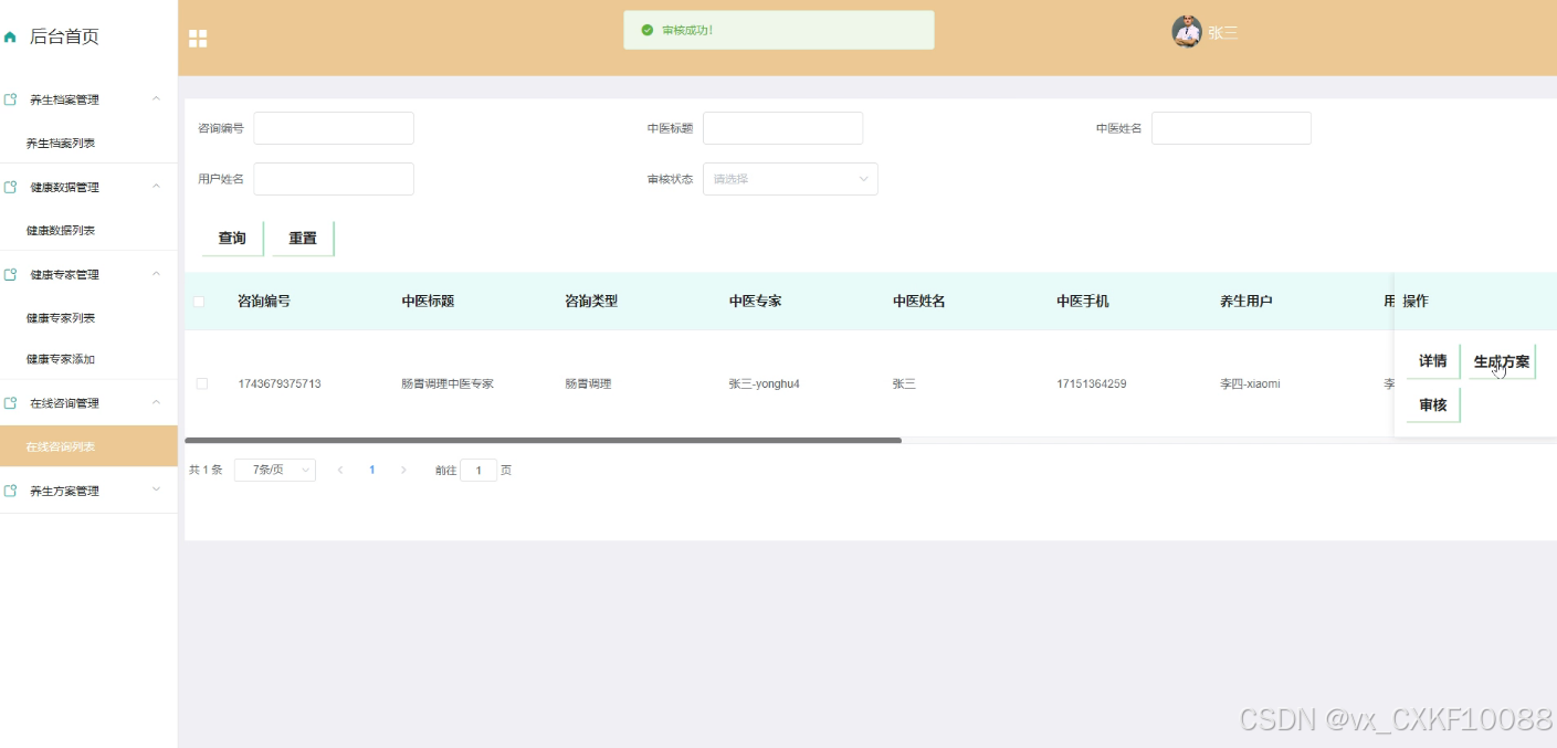- 在线咨询管理:管理员可以对在线咨询记录进行删除、查询操作,并查看在线咨询的详细信息,生成相应的养生方案,审核咨询内容,以确保咨询服务的质量和专业性。