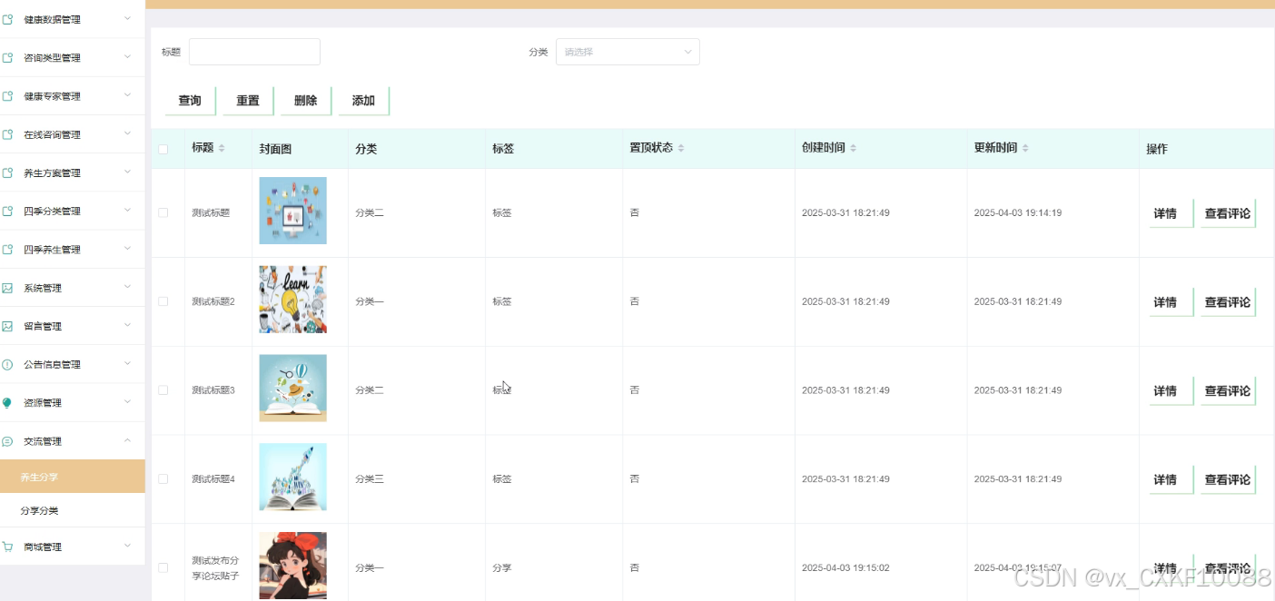 - 养生方案管理:管理员可以对养生方案进行删除、查询操作,并查看养生方案的详细信息,为用户提供科学的养生指导。