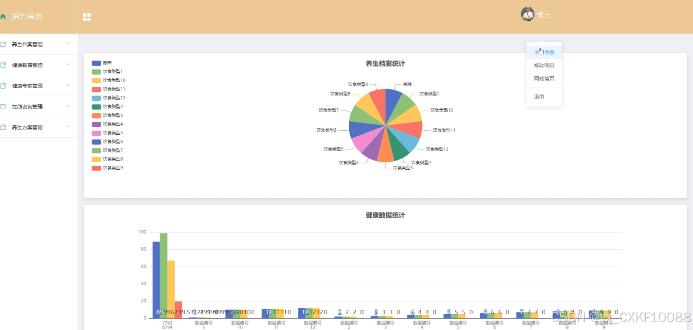 - 后台首页概览:用户登录后可进入后台首页,这里提供了养生档案的统计信息、健康数据的统计图表,以及第三方体质测试软件的接入。此外,用户还可以点击个人头像来查看或修改个人信息和密码,方便用户管理自己的账户。