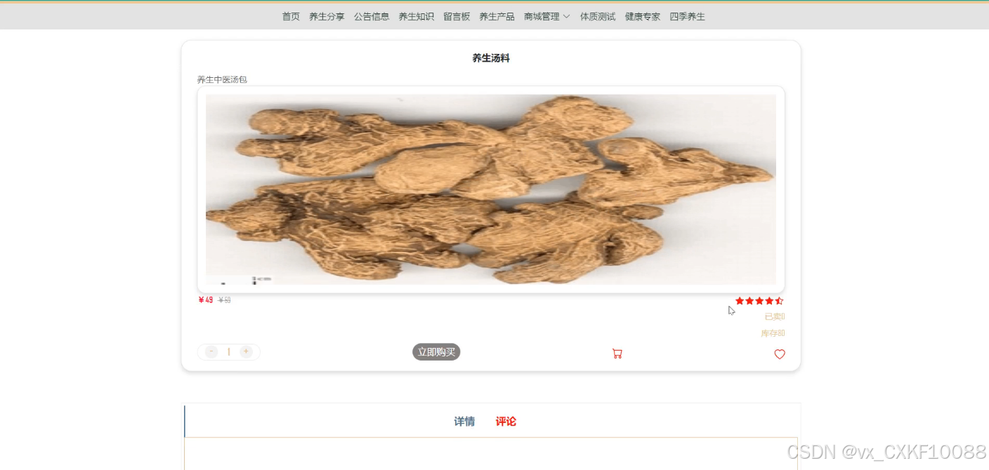 - 养生产品:用户可以浏览养生产品,并通过“立即购买”或“加入购物车”功能进行购买。购买后,用户还可以对产品进行评论。养生产品模块为用户提供高质量的健康产品。