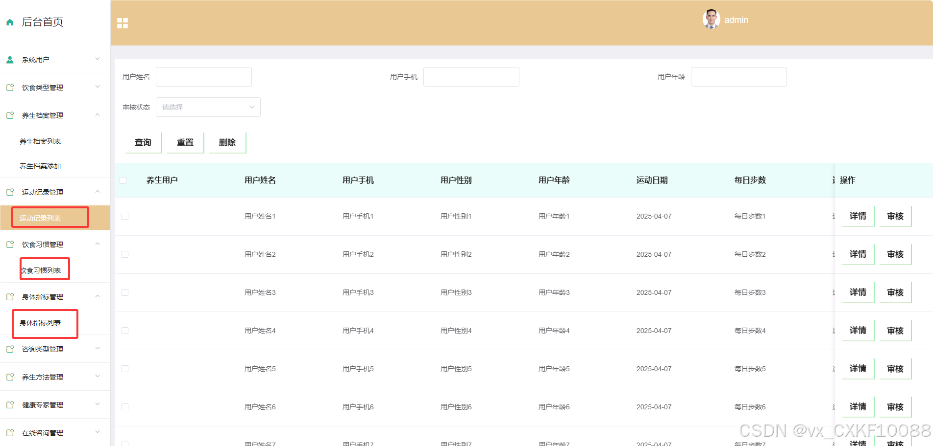 - 身体指标管理:管理员可以对用户的各项身体指标进行删除和查询操作,点击指标详情可以为用户提供健康建议,并进行审核,以确保建议的专业性和有效性。