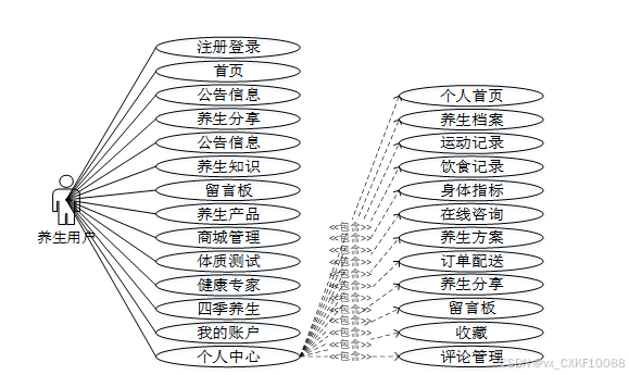 综上所述,本设计采用SpringBoot、VUE框架及HeidiSQL数据库开发,可供用户和管理员使用。用户功能包括:注册登录、首页浏览、养生论坛、养生文章、养生知识、公告信息等;管理员功能则包括登录、用户信息管理、养生文章管理、养生知识管理、论坛管理及系统公告、轮播图等。