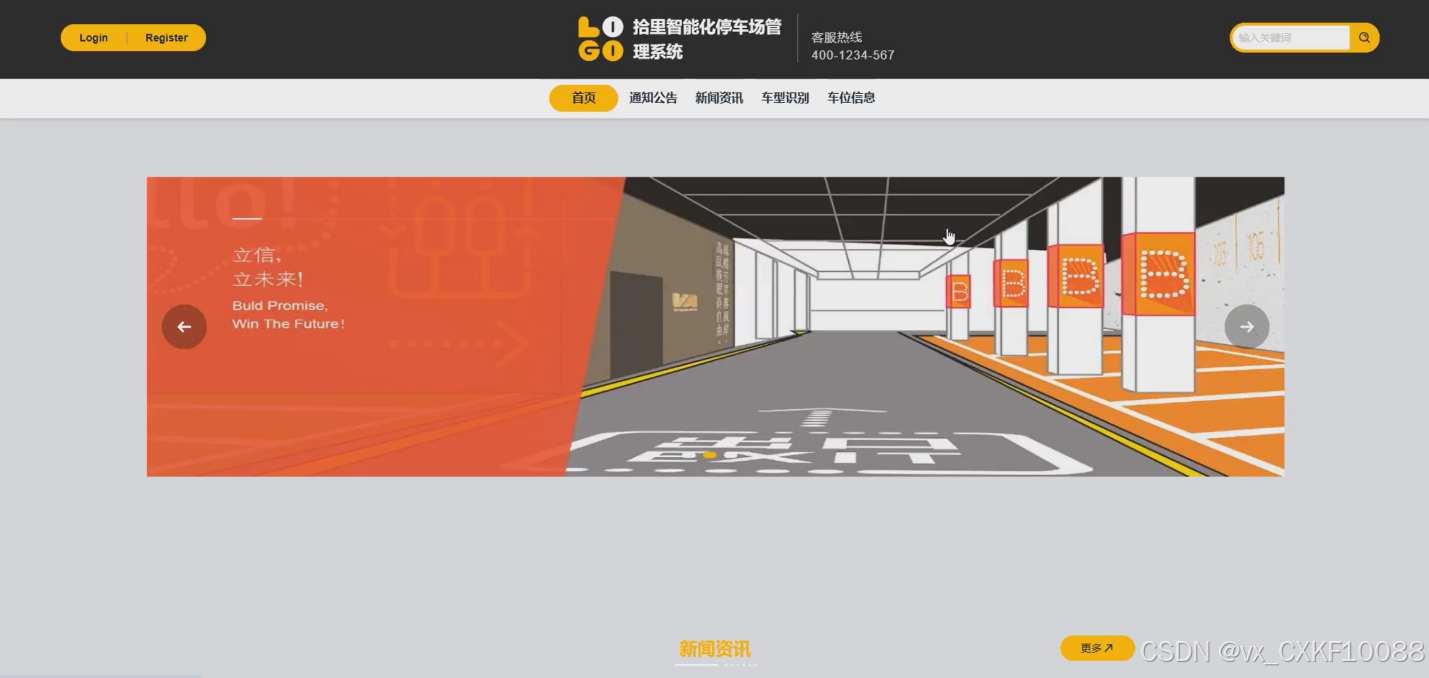 首页:作为用户进入系统的第一界面,展示停车场的核心功能入口,包括车位信息查询、新闻资讯等,为用户提供一站式停车服务。