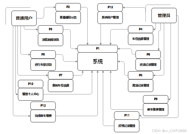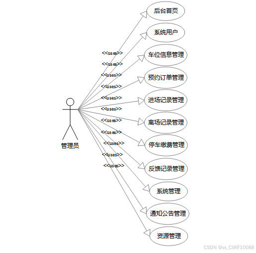 普通用户可以通过系统查看通知公告,浏览新闻资讯,进行车型识别,查询车位信息,管理个人中心的内容,包括预约订单、进场记录、离场记录、停车缴费、反馈记录和收藏等。管理员则拥有全面的系统管理权限,包括查看后台首页信息,管理车位信息、预约订单、进场记录、离场记录、停车缴费和反馈记录,监控系统运行状态,分析用户行为,以及进行系统管理。此外,管理员还可以进行用户管理,资源管理,确保平台内容的丰富性和时效性。