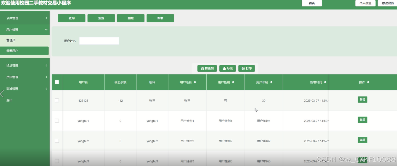 系统用户管理模块允许管理员查看所有注册用户的详细信息,包括用户名、注册时间、登录记录等,并支持对违规用户进行禁用或启用操作。同时,管理员可批量导出用户数据,便于进一步分析或存档,确保用户管理高效且灵活。界面如下图所示。