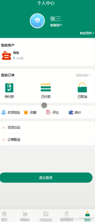 用户在“我的”页面查看个人信息、订单配送、收货地址、收藏和评论等。界面如下图所示。