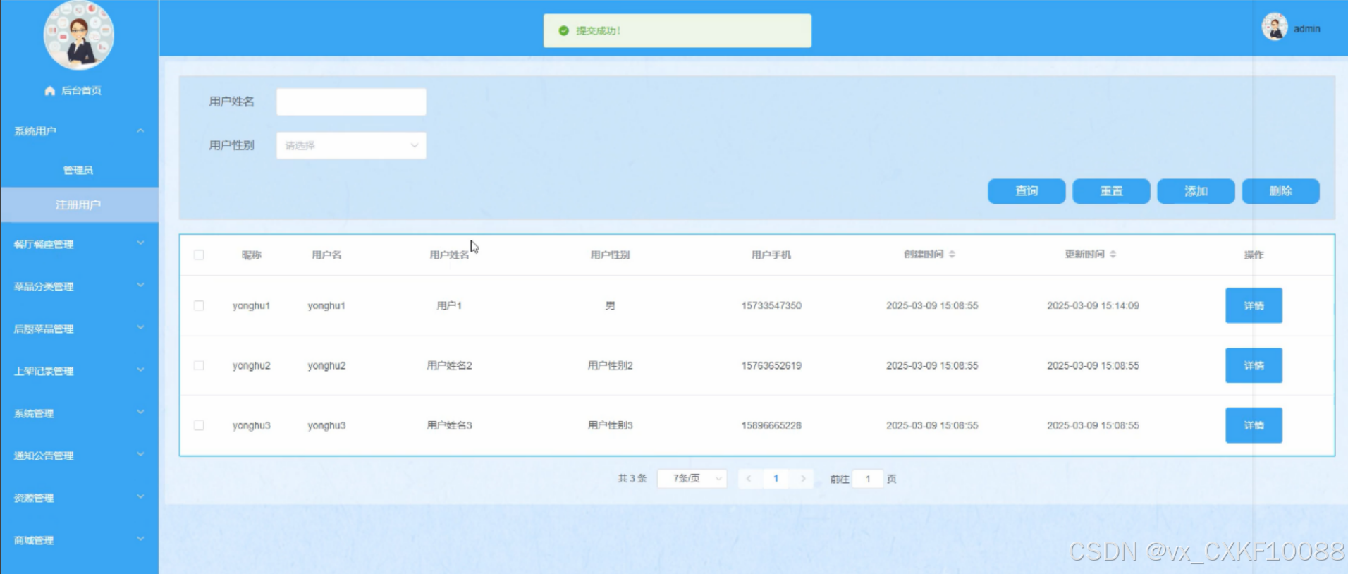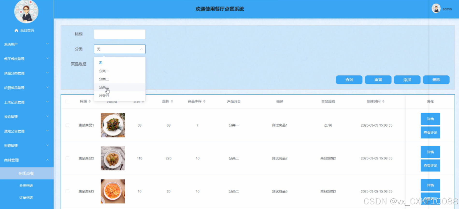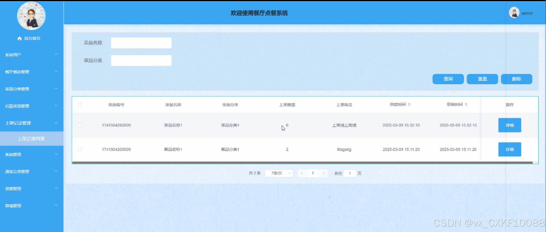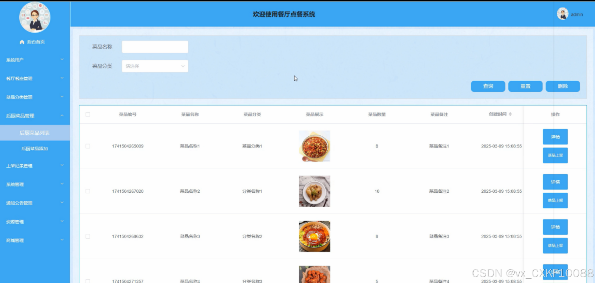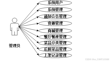管理员可登录系统进行管理系统用户、餐厅餐座管理、菜品分类管理、后厨菜品管理、上架记录管理、系统管理、通知公告管理、资源管理、商城管理等信息。
