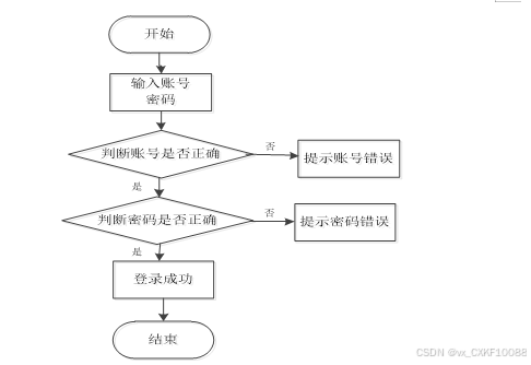 用户输入账号和密码后,系统首先判断账号是否正确,若不正确则提示“账号错误”;如果账号正确,则继续判断密码是否正确,若密码错误则提示“密码错误”;若账号和密码均正确,则显示“登录成功”,最后结束流程。如图3-4所示。