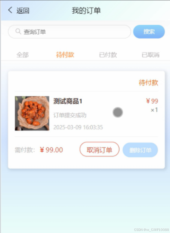 用户可以通过“我的订单”查看订单的详细信息、状态以情况,同时支持订单的查询、取消及再次购买等功能,提升用户对订单管理的掌控度。我的订单界面如图5-3所示。