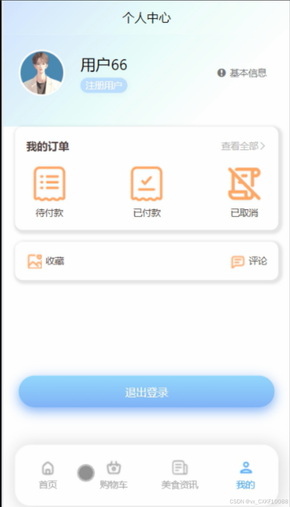 作为用户的个性化中心,集成了订单历史记录,便于用户回顾过往消费经历;收藏夹功能,保存用户喜爱的餐厅、菜品或资讯,便于日后快速访问;以及个人信息管理模块,支持用户编辑个人资料、联系方式、密码安全及偏好设置,全方位满足用户的个性化需求,提升账户的安全性与便利性。我的界面如图5-7所示。