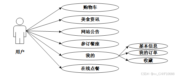 用户可进行注册登录、购物车、美食资讯、餐厅餐座、在线点餐、网站公告、我的(我的订单、收藏、基本信息)等功能。用户用例图如图3-1所示。