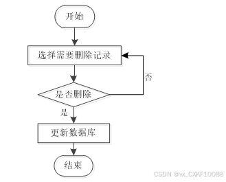 用户首先选择需要删除的记录,然后系统判断是否执行删除操作。如果用户选择不删除,则返回重新选择;如果选择删除,则更新数据库完成记录删除操作,最后结束流程。如图3-6所示。