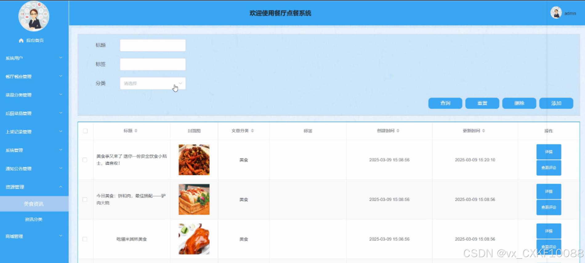 构建丰富的美食资讯库,涵盖菜谱教程、食材知识、餐厅评测等内容,支持资讯分类、标签管理、搜索优化等功能,为用户提供有价值的信息。界面如图5-10所示。