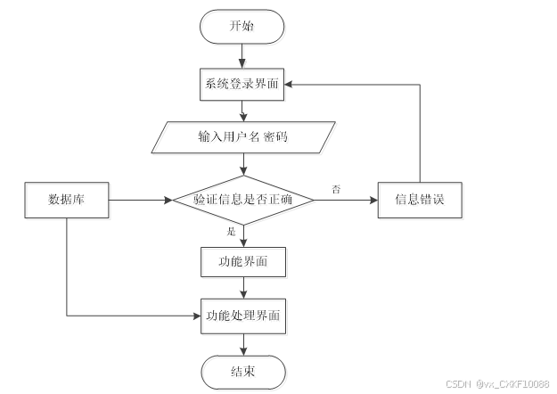 用户从“系统登录界面”开始,输入用户名和密码后,系统验证其信息是否正确。如果验证通过,则进入功能界面并进一步进入功能处理界面,最后流程结束;如果验证失败,则显示“信息错误”,用户需要重新输入。数据库支持验证过程。如图3-3所示。