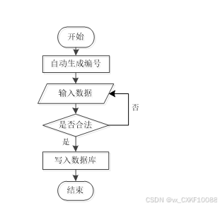 系统开始后自动生成编号,用户输入数据。系统判断输入的数据是否合法,若不合法则返回重新输入;若合法,则将数据写入数据库,最后结束流程。如图3-5所示。