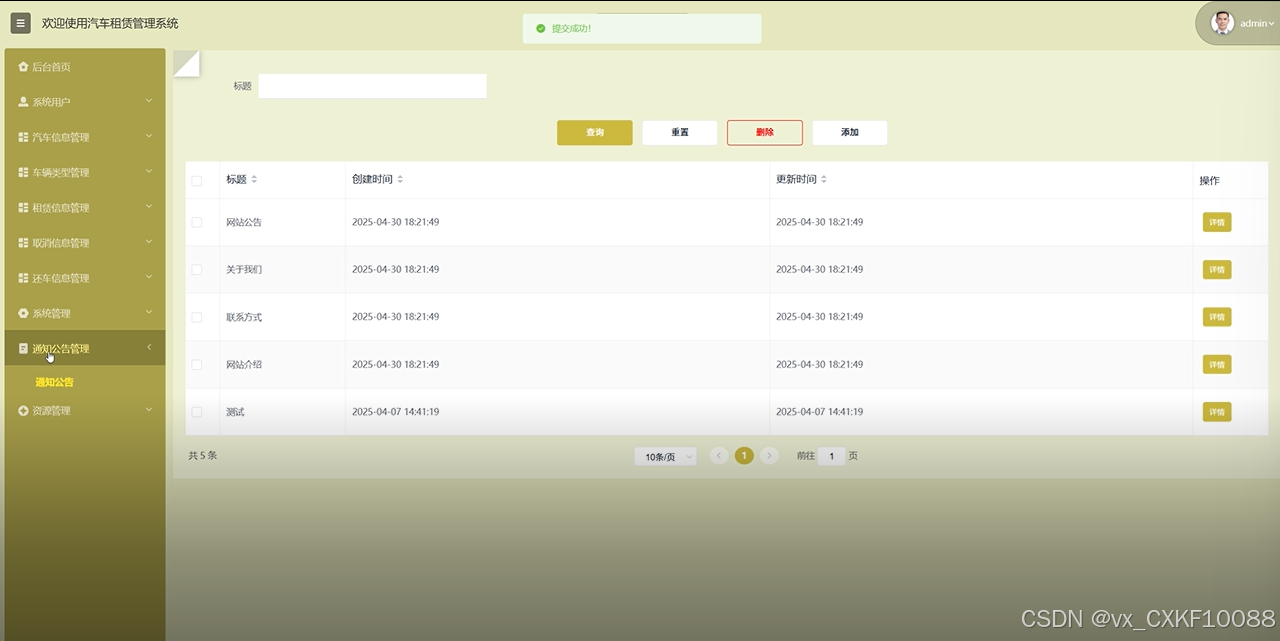 | 用户在线租车信息提交成功,生成租赁信息列表 | 结果输出符合预期 | 通过 |