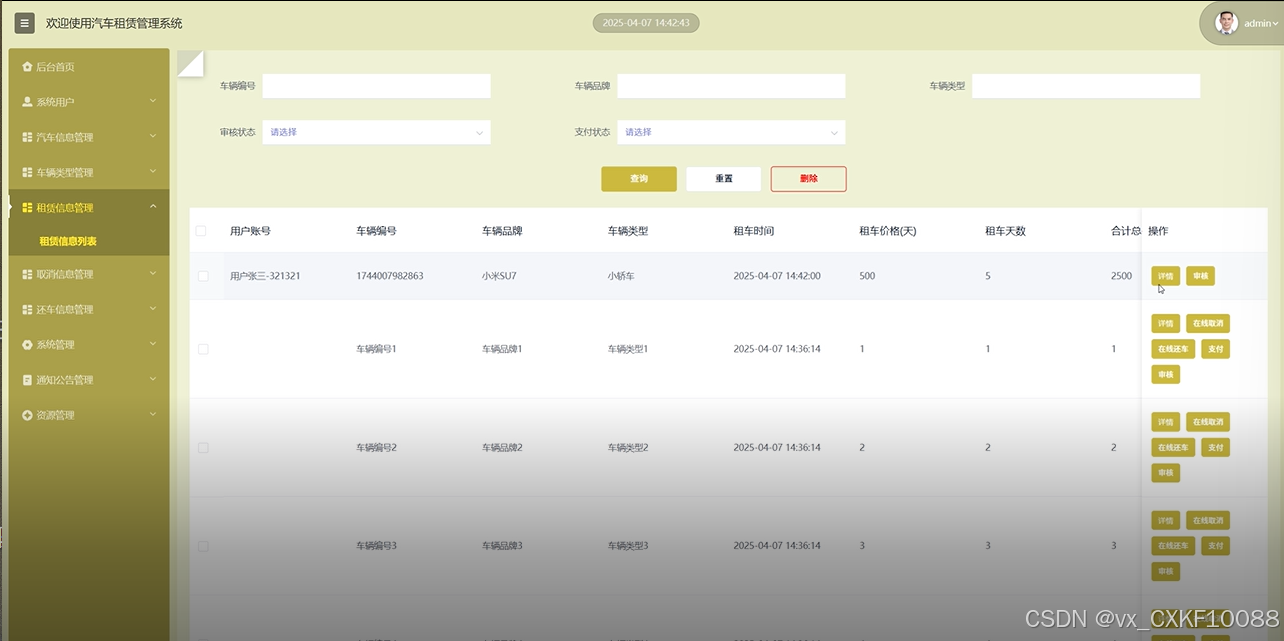 管理员点击“租赁信息管理”这一菜单,可以查看和审核用户提交的租赁信息和支付状态,还可以进行查询、重置、删除等操作。租赁信息列表界面如下图所示。