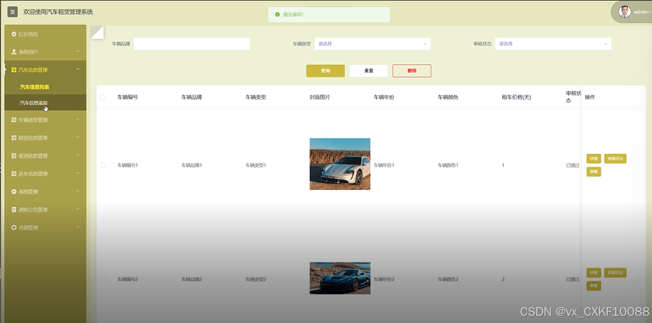 汽车信息:用户可以查看平台上可租赁车辆的详细信息,包括车型、品牌、价格、车况、租赁规则等。该模块提供了多种筛选功能,方便用户根据需求快速找到适合的车辆。
