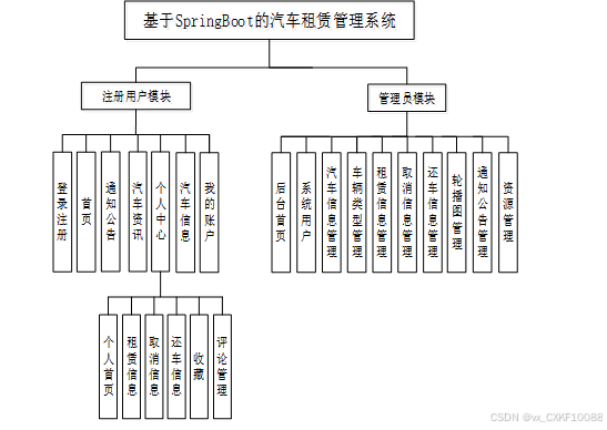本文所设计和实现的基于SpringBoot的汽车租赁管理系统,旨在通过信息化手段提升汽车租赁业务的管理效率和用户体验。系统主要分为两个角色:注册用户和管理员。每个角色有不同的功能模块,具体功能如下: