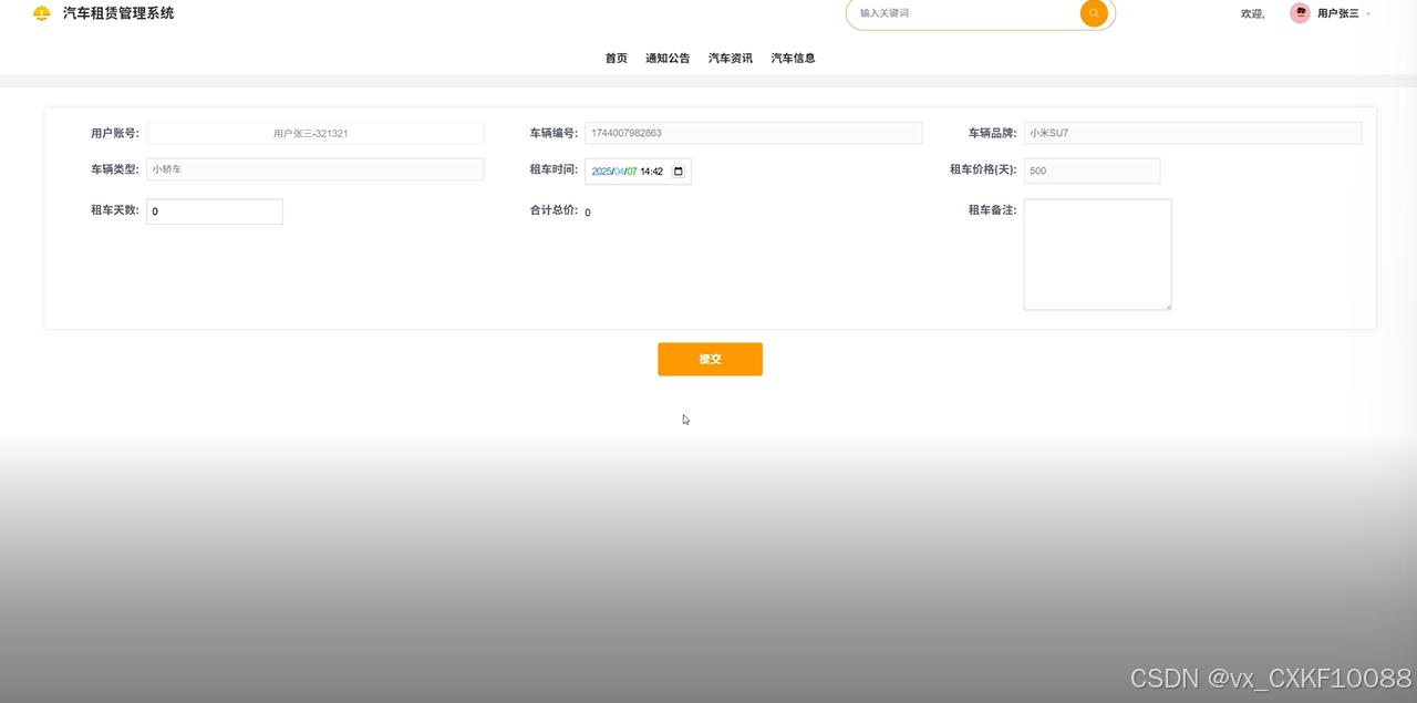 首页:登录成功后的首页展示了系统的核心内容,如热门车辆、最新租赁信息以及促销活动等。首页采用简洁明了的设计,帮助用户快速找到所需内容。