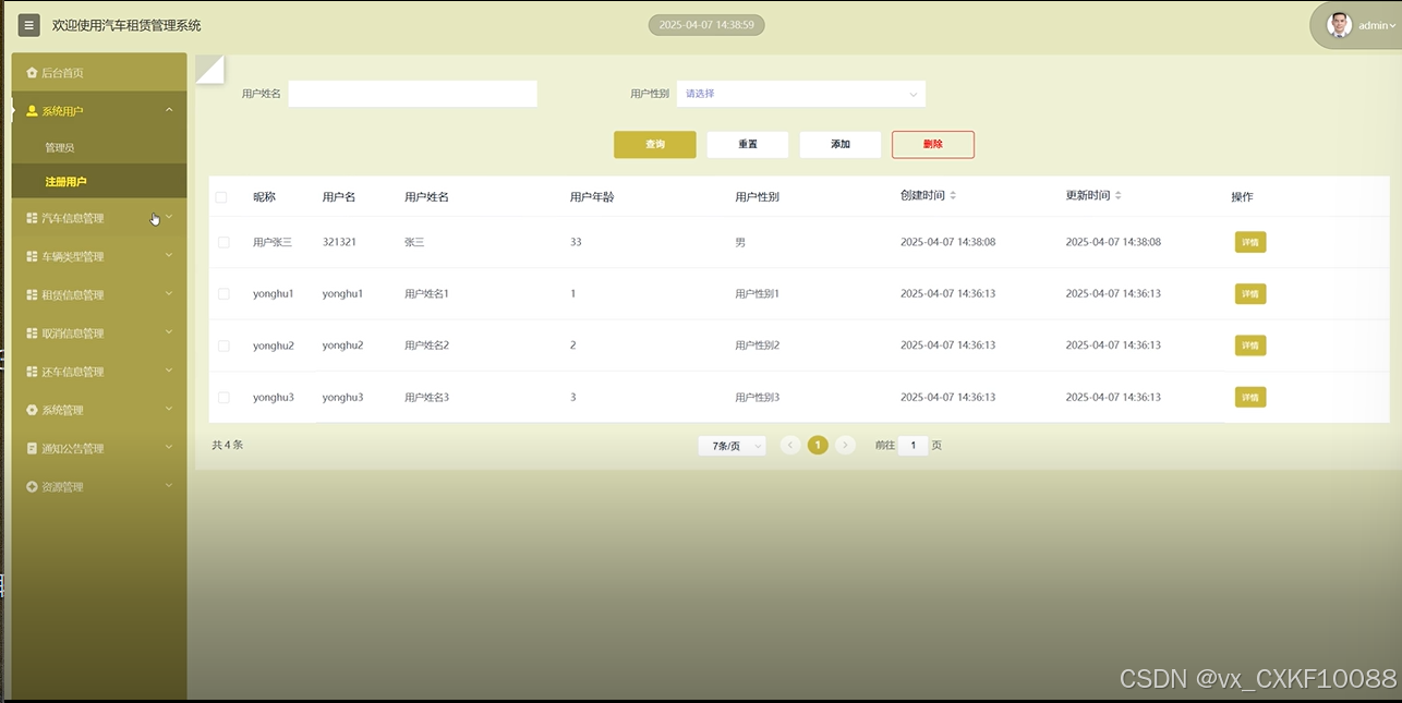 基于SpringBoot的汽车租赁管理系统中的管理人员是可以对注册用户和管理员进行管理的,包括对用户信息进行增删改查等操作,也可以对管理员进行管控。界面如下图5-10所示。