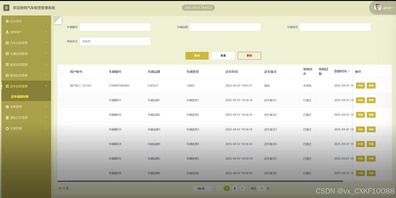 管理员点击“还车信息管理”这一菜单,可以查看并审核用户提交的还车信息,还可以进行查询、重置、删除等操作。还车信息列表界面如下图5-16所示。