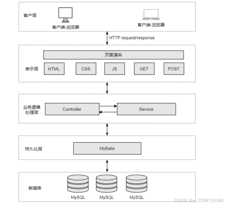 B/S(Browser/Server)架构是一种基于浏览器和服务器的系统架构模式,用户通过浏览器与服务器进行交互。B/S架构简化了客户端的部署和管理,用户无需在本地安装复杂的软件,只需使用标准浏览器即可访问应用程序。服务器端负责处理业务逻辑和数据存储,客户端则主要负责展示用户界面和数据交互[3]。B/S架构的设计使得系统更新和维护集中在服务器端,降低了维护成本。