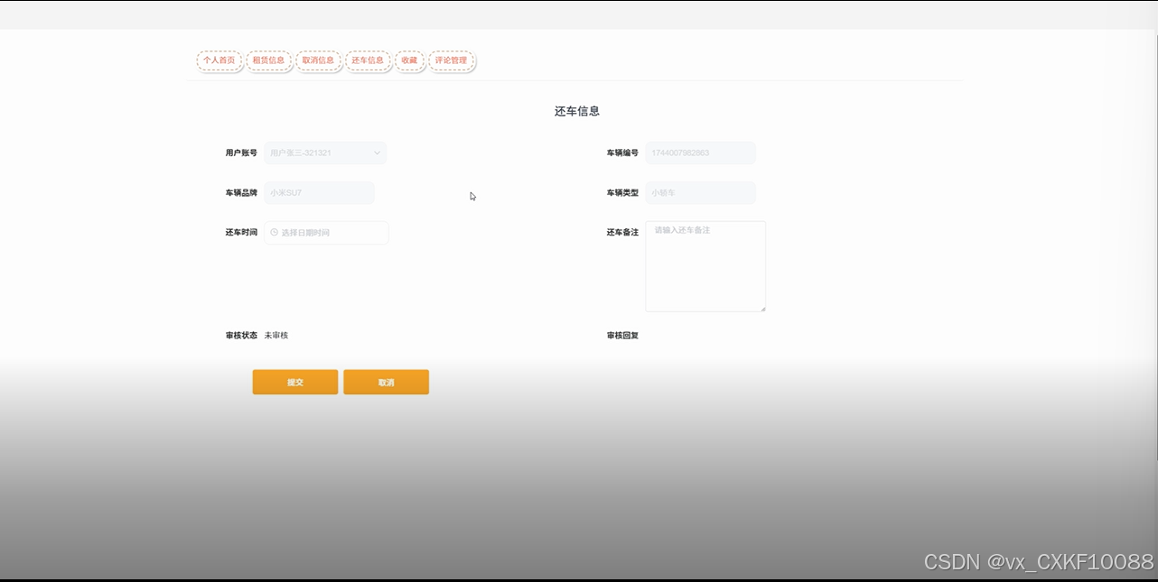 还车信息:用户可以查看和提交还车信息,系统会记录还车时间、车况检查等内容。